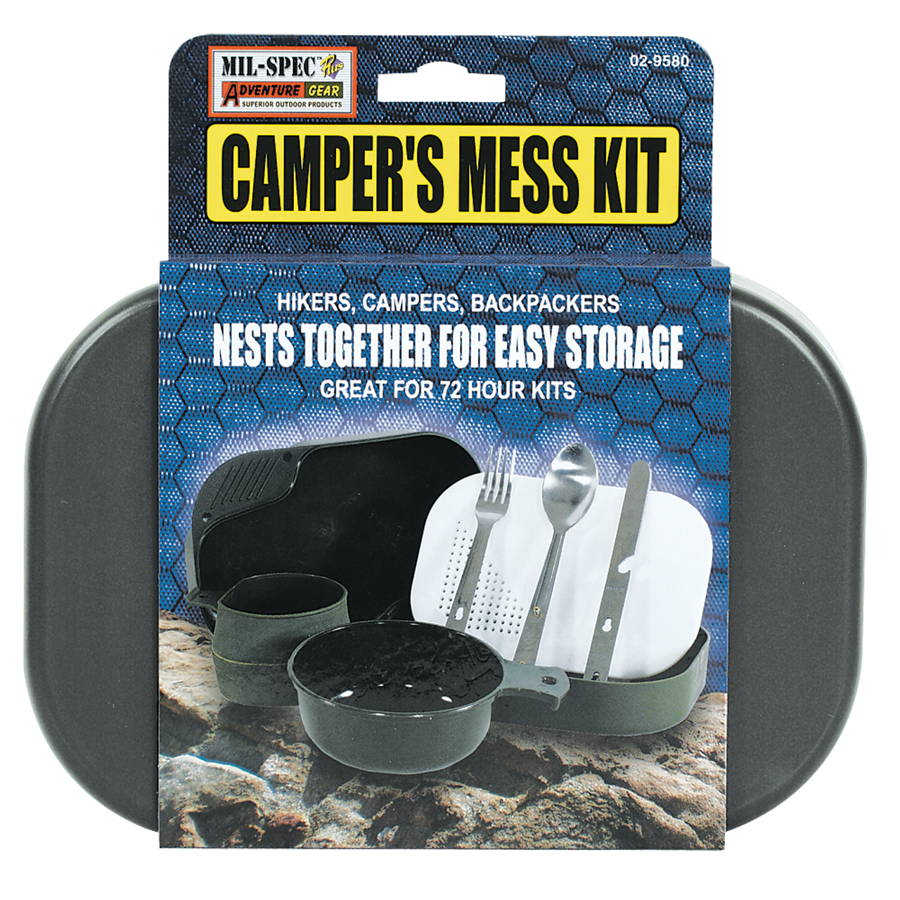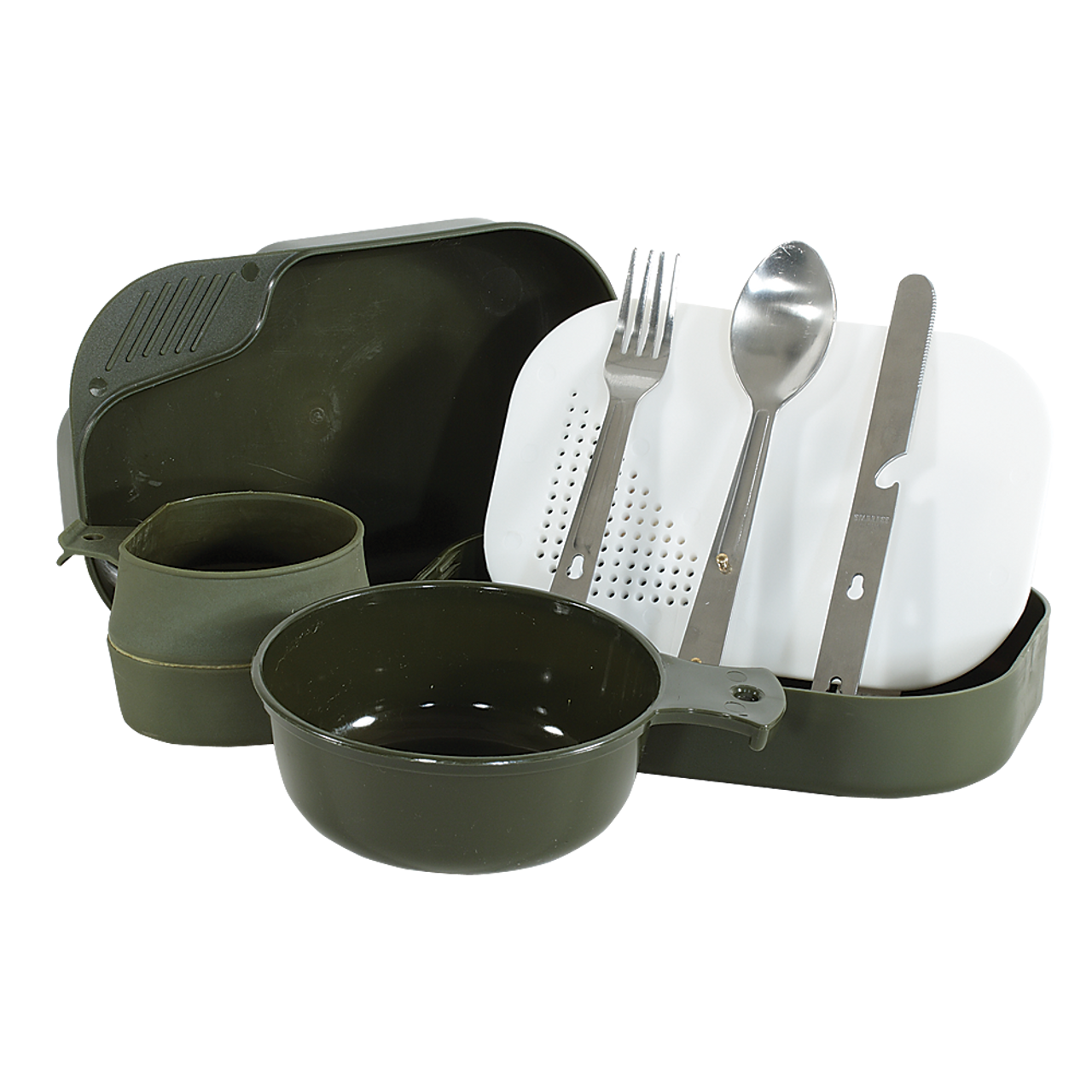 Made of unbreakable, easy to clean, Olive Drab molded plastic. Neatly stored inside the flat oval-shaped kit is a stainless steel interlocking cutlery set consisting of a knife, fork and spoon, a nylon cutting board with strainer, a folding drink cup, soup or cereal bowl with attached handle. Both the lid and bottom of the kit double as meal bowls. The bottom bowl has a nifty attached handle that works great for hot foods.