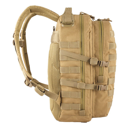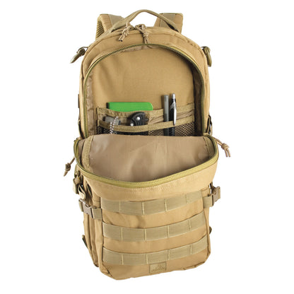 The Element Day Pack is a compact option for a 24-hour pack or bug-out bag. A padded mesh back panel serves as a concealed pocket or provides storage for almost any hydration bladder up to 3.0 liters (hydration bladder sold separately, see P.33) and works with the adjustable reinforced padded mesh shoulder straps. A sternum strap evenly distributes the weight across your shoulders. The main compartment contains both mesh and zippered slip pockets while the front compartment houses a built-in slip divider. The exterior of the pack is covered in MOLLE webbing for rapidly attaching gear and has a morale patch area at the top. The Element Day Pack can be cinched down when not completely full by using the four compression straps.