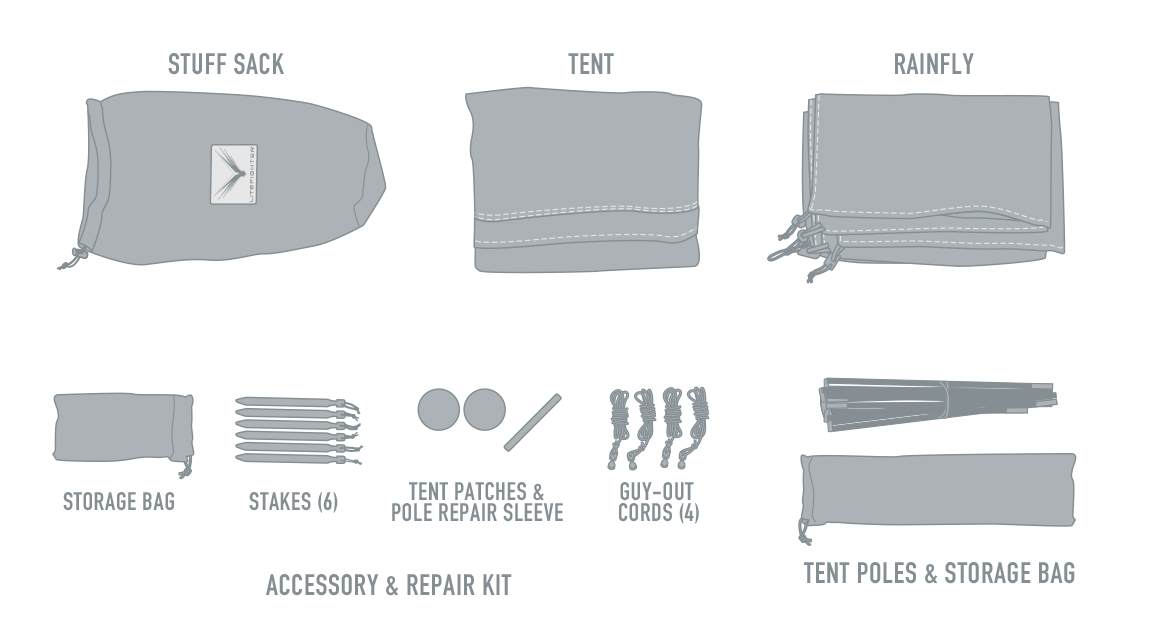 The system includes: 70D inner tent, 30D rainfly cover, all-in-one pole frame, 6 ground stakes, accessory kit (fabric repair patches, tent pole repair splint, 4 tent guy-outs w/molded tensioners, waterproof visual user guide, accessory kit bag), tent carry case.